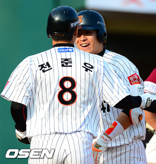 2일 오후 사직구장에서 열린 '2012 팔도 프로야구' 롯데 자이언츠와 넥센 히어로즈의 경기에서 1회말 2사 주자 만루 롯데 강민호가 좌중월 만루 홈런을 날린 후 홈에서 전준우와 기쁨을 나누고 있다.
