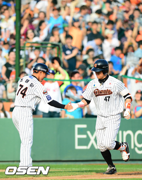 2일 오후 사직구장에서 열린 '2012 팔도 프로야구' 롯데 자이언츠와 넥센 히어로즈의 경기에서 1회말 2사 주자 만루 롯데 강민호가 좌중월 만루 홈런을 날린 후 3루에서 조원우 코치와 하이파이브를 하고 있다.