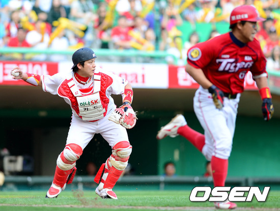 2일 오후 인천 문학구장에서 열린 '2012 팔도 프로야구' SK 와이번스와 KIA 타이거즈의 경기 3회초 무사 1루 타석에 박기남이 희생번트를 SK 포수 정상호가 잡아 1루로 송구하고 있다.