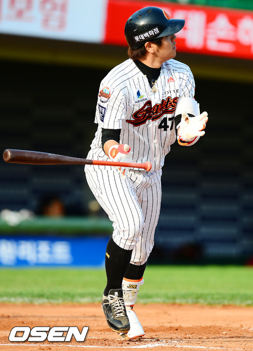 2일 오후 사직구장에서 열린 '2012 팔도 프로야구' 롯데 자이언츠와 넥센 히어로즈의 경기에서 1회말 2사 주자 만루 롯데 강민호가 좌중월 만루 홈런을 날린 후 배트를 던지고 있다.