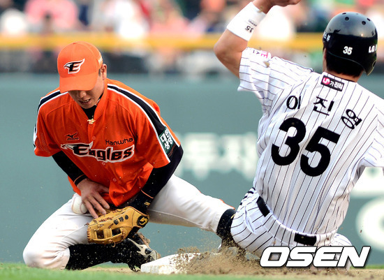 2일 오후 서울 잠실구장에서 열린 '2012 팔도 프로야구' LG 트윈스와 한화 이글스의 경기, 2회말 1사 1루 오지환 3루수앞 땅볼때 1루주자 이진영, 한화 오선진 3루수의 2루 악송구로 세이프되고 있다.