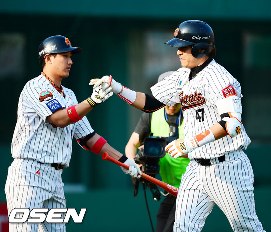 2일 오후 사직구장에서 열린 '2012 팔도 프로야구' 롯데 자이언츠와 넥센 히어로즈의 경기에서 1회말 2사 주자 만루 롯데 강민호가 좌중월 만루 홈런을 날린 후 홈에서 황재균과 하이파이브를 하고 있다.