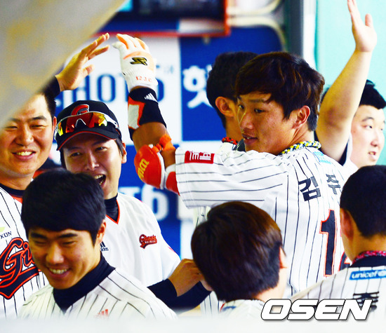 2일 오후 사직구장에서 열린 '2012 팔도 프로야구' 롯데 자이언츠와 넥센 히어로즈의 경기에서 4회말 2사 주자 없는 상황에서 롯데 김주찬이 좌월 솔로 홈런을 날린 후 동료들이 덕아웃 밖이 아닌 덕아웃 안에서 하이파이브를 하고 있다.