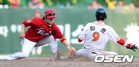 2일 오후 인천 문학구장에서 열린 '2012 팔도 프로야구' SK 와이번스와 KIA 타이거즈의 경기 5회말 무사 1루 정상호 타석, 1루주자 임훈이 도루에 실패하고 있다.