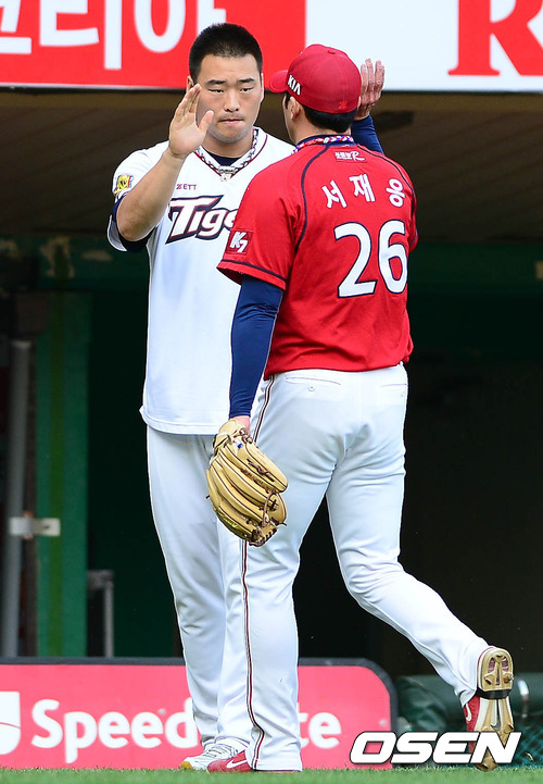 2일 오후 인천 문학구장에서 열린 '2012 팔도 프로야구' SK 와이번스와 KIA 타이거즈의 경기 5회말을 마친 서재응이 덕아웃으로 향하며 김진우와 하이파이브를 하고 있다.