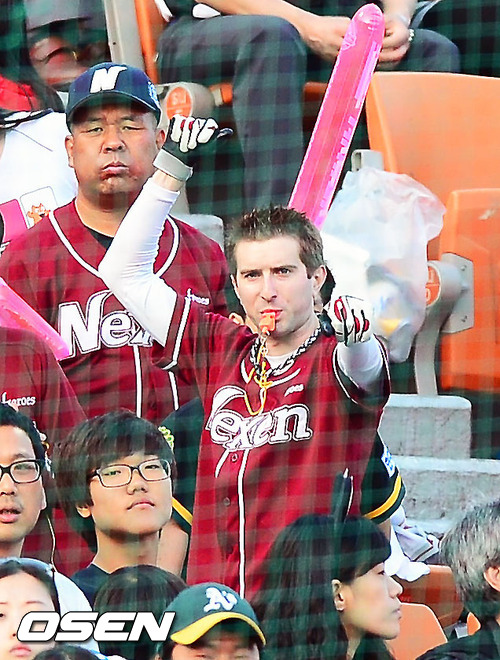 2일 오후 사직구장에서 열린 '2012 팔도 프로야구' 롯데 자이언츠와 넥센 히어로즈의 경기에서 넥센 외국인 열성팬 테드짱(테드 스미스)이 응원을 하고 있다.