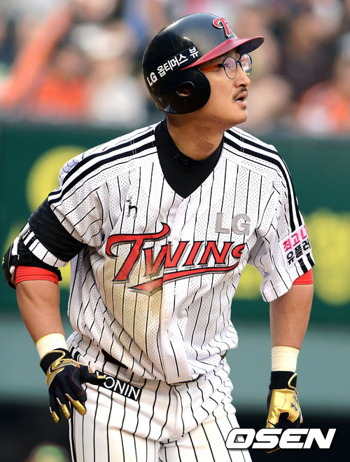 2일 오후 서울 잠실구장에서 열린 '2012 팔도 프로야구' LG 트윈스와 한화 이글스의 경기, 4회말 1사 만루 LG 박용택이 싹쓸이 2루타를 치고 타구를 바라보고 있다.