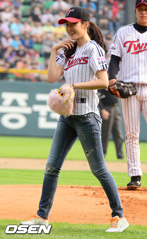2일 오후 서울 잠실구장에서 열린 '2012 팔도 프로야구' LG 트윈스와 한화 이글스의 경기 전 공현주가 시구를 하고 있다.