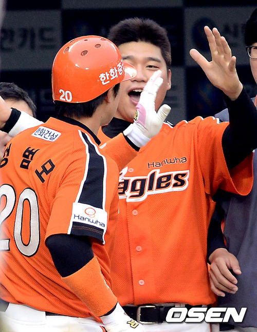 2일 오후 서울 잠실구장에서 열린 '2012 팔도 프로야구' LG 트윈스와 한화 이글스의 경기, 6회초 무사 한화 정범모가 솔로 홈런을 치고 덕아웃에서 최진행과 하이파이브를 하고 있다.