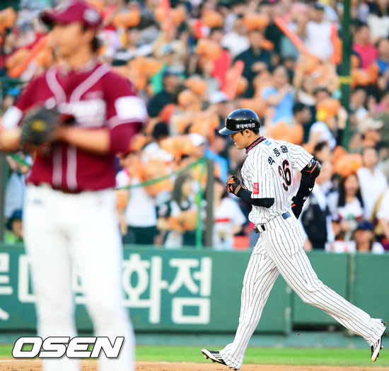 2일 오후 사직구장에서 열린 '2012 팔도 프로야구' 롯데 자이언츠와 넥센 히어로즈의 경기에서 7회말 1사 주자 1,2루 롯데 박종윤이 우월 스리런 홈런을 날린 후 그라운드를 돌고 있다.