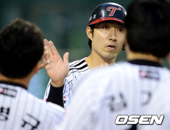 2일 오후 서울 잠실구장에서 열린 '2012 팔도 프로야구' LG 트윈스와 한화 이글스의 경기,7회말 1사 1,2루 LG 정성훈이 좌측 담장을 넘기는 3점 홈런을 치고 덕아웃에서 선수들과 하이파이브를 하고 있다.
