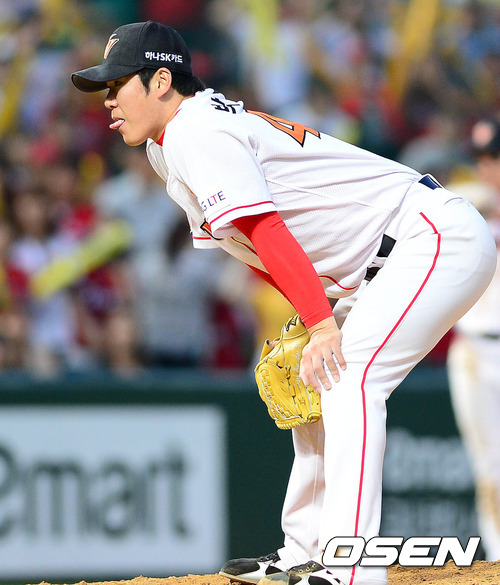 2일 오후 인천 문학구장에서 열린 '2012 팔도 프로야구' SK 와이번스와 KIA 타이거즈의 경기 9회초 2사 김원석의 타석, 박희수가 볼넷을 내주자 허탈한 표정을 짓고 있다.