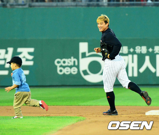경기를 마친 후 최근 등에 담(등배 근육 경직)증상으로 세경기째 결장중인 롯데 홍성흔이 아들 화철군과 딸 화리양과 함께 그라운드에서 야구놀이를 하고 있다./ rumi@osen.co.kr