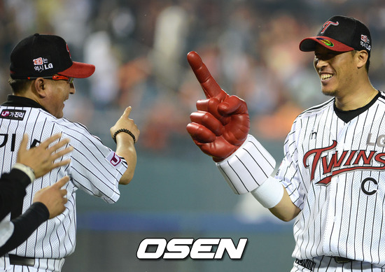 경기 종료후 LG 김기태 감독과 이병규가 손가락 세레모니를 하고 있다. / youngrae@osen.co.kr