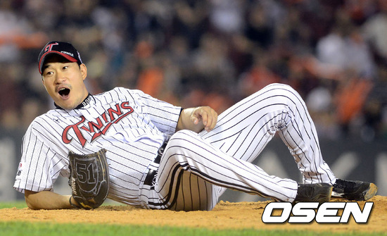 9회초 LG 봉중근과 날아온 배트를 피하다 넘어져 놀라고 있다./youngrae@osen.co.kr