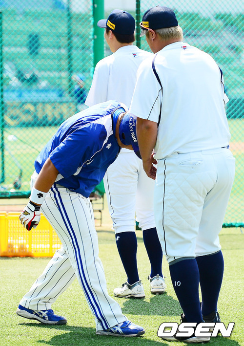 3일 오후 대구 시민구장에서 '2012 팔도 프로야구' 삼성 라이온즈와 두산 베어스의 경기가 열릴 예정인 가운데 양팀 훈련시간에 삼성 최형우가 두산 최준석의 배에 박치기를 하고 있다.