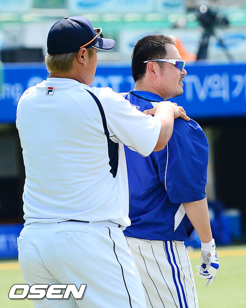 3일 오후 대구 시민구장에서 '2012 팔도 프로야구' 삼성 라이온즈와 두산 베어스의 경기가 열릴 예정인 가운데 두산 최준석이 삼성 진갑용의 어깨를 주무르고 있다.