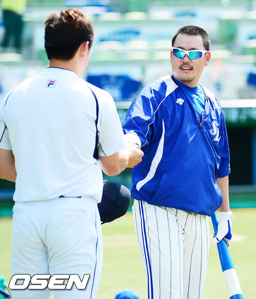 3일 오후 대구 시민구장에서 '2012 팔도 프로야구' 삼성 라이온즈와 두산 베어스의 경기가 열릴 예정인 가운데 삼성 진갑용이 두산 이성열과 악수를 나누고 있다.