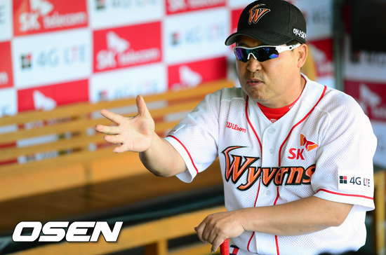 2일 오후 인천 문학구장에서 열리는 '2012 팔도 프로야구' SK 와이번스와 KIA 타이거즈의 경기 시작전 이만수 감독이 취재진들과 이야기를 나누고 있다.
