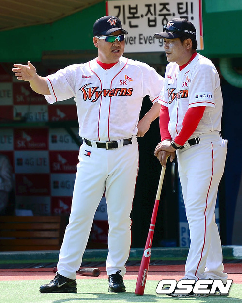 2일 오후 인천 문학구장에서 열리는 '2012 팔도 프로야구' SK 와이번스와 KIA 타이거즈의 경기 시작전 이만수 감독과 이광근 코치가 이야기를 나누고 있다.