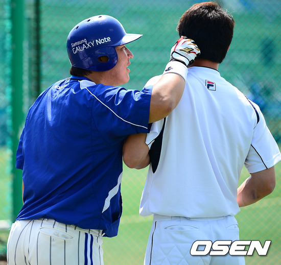 3일 오후 대구 시민구장에서 '2012 팔도 프로야구' 삼성 라이온즈와 두산 베어스의 경기가 열릴 예정인 가운데 삼성 최형우가 두산 고영민의 귀를 잡으며 장난을 치고 있다.