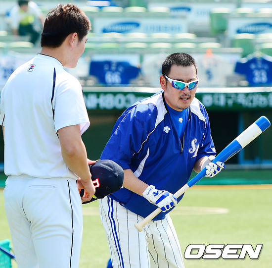 3일 오후 대구 시민구장에서 '2012 팔도 프로야구' 삼성 라이온즈와 두산 베어스의 경기가 열릴 예정인 가운데 삼성 진갑용이 두산 이성열 앞에서 번트 자세를 선보이고 있다.