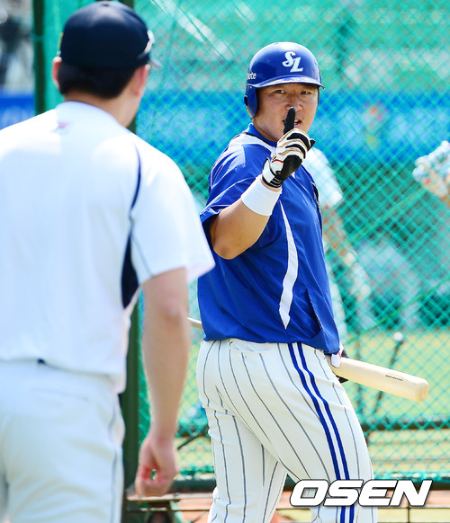 3일 오후 대구 시민구장에서 '2012 팔도 프로야구' 삼성 라이온즈와 두산 베어스의 경기가 열릴 예정인 가운데 삼성 최형우가 두산 이성열과 얘기를 나누고 있다.