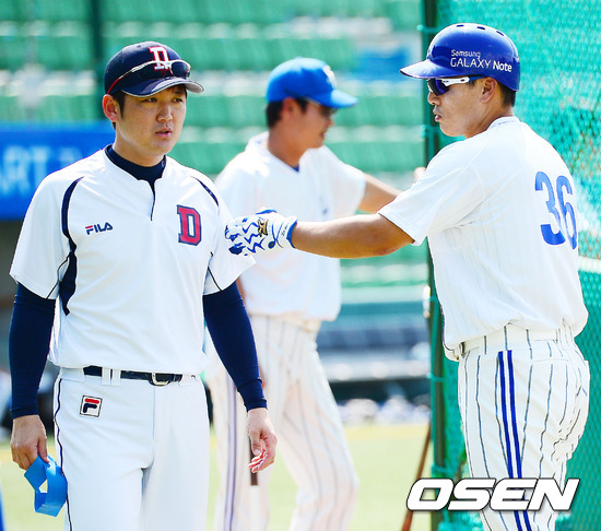 3일 오후 대구 시민구장에서 '2012 팔도 프로야구' 삼성 라이온즈와 두산 베어스의 경기가 열릴 예정인 가운데 삼성 이승엽이 두산 김선우에게 말을 걸고 있다.