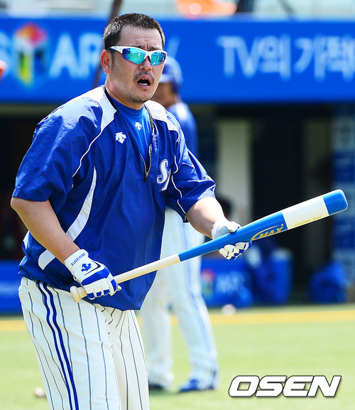3일 오후 대구 시민구장에서 '2012 팔도 프로야구' 삼성 라이온즈와 두산 베어스의 경기가 열릴 예정인 가운데 삼성 진갑용이 번트 연습을 하며 얼굴을 찡그리고 있다.