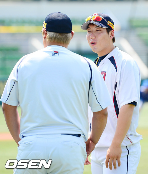 3일 오후 대구 시민구장에서 '2012 팔도 프로야구' 삼성 라이온즈와 두산 베어스의 경기가 열릴 예정인 가운데 삼성 이승엽의 타격연습을 바라보던 두산 김현수가 최준석에게 말을 하고 있다.