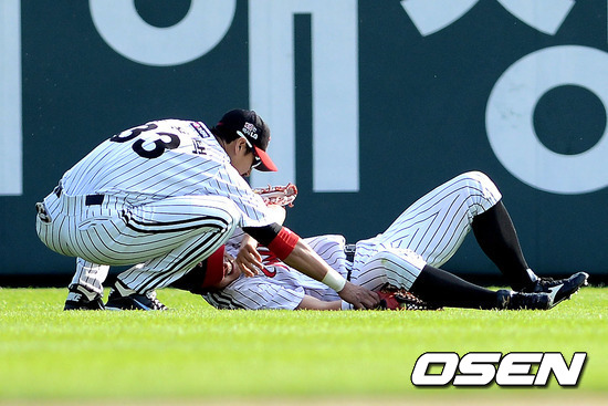 3일 오후 서울 잠실구장에서 열린 '2012 팔도 프로야구' LG 트윈스와 한화 이글스의 경기, 1회초 LG 이진영이 한화 이대수의 타구를 잡으려다 부상을 당해 고통스러워 하고 있다.