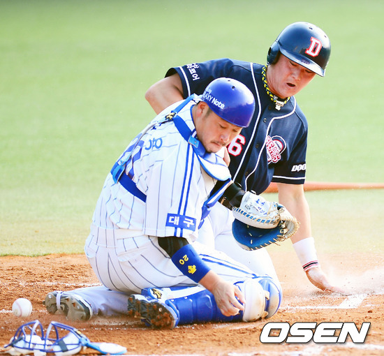 3일 오후 대구 시민구장에서 열린 '2012 팔도 프로야구' 삼성 라이온즈와 두산 베어스의 경기 2회초 1사 주자 2루 두산 최준석이 중견수 앞 선취 1타점 적시타때 2루 주자 이성열이 홈에서 세이프 되고 있다.