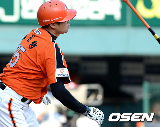 3일 오후 서울 잠실구장에서 열린 '2012 팔도 프로야구' LG 트윈스와 한화 이글스의 경기, 2회초 2사 1,3루 한화 최진행이 좌측담장을 넘기는 3점 홈런을 치고 있다.