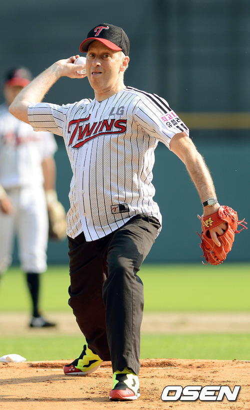 3일 오후 서울 잠실구장에서 열린 '2012 팔도 프로야구' LG 트윈스와 한화 이글스의 경기,'정의란 무엇인가'의 저자 마이클 샌델 하버드 대학 교수가 시구를 하고 있다.