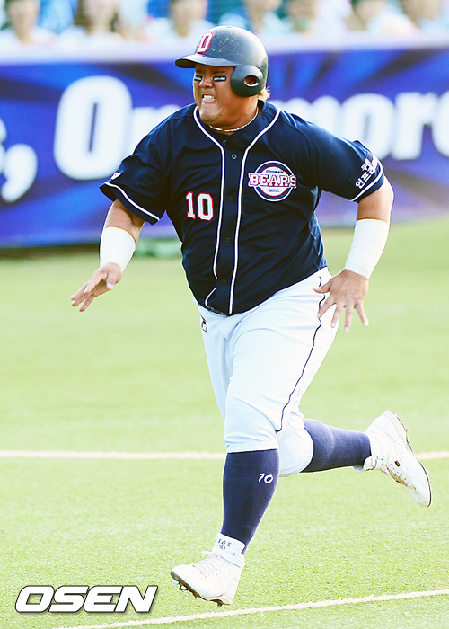 3일 오후 대구 시민구장에서 열린 '2012 팔도 프로야구' 삼성 라이온즈와 두산 베어스의 경기 2회초 2사 주자 1,3루 두산 최재훈의 좌익수 플라이 아웃 타구때 3루 주자 최준석이 홈으로 달리고 있다.