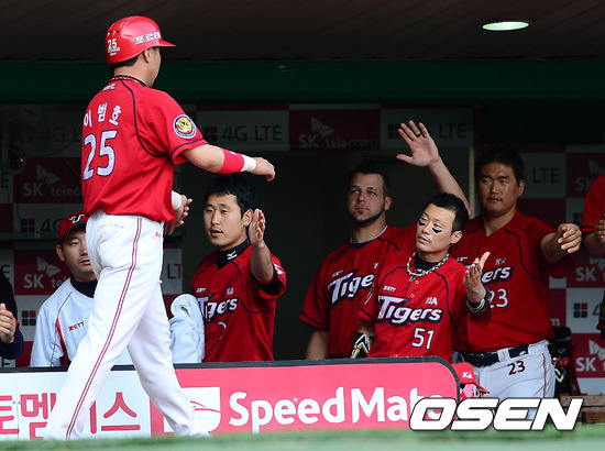 2일 오후 인천 문학구장에서 열린 '2012 팔도 프로야구' SK 와이번스와 KIA 타이거즈의 경기 4회초 1사 만루 송산의 타석, 밀어내기로 홈을 밟은 이범호가 덕아웃에서 동료들과 하이파이브를 하고 있다.