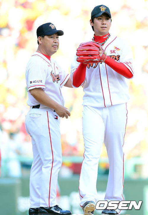2일 오후 인천 문학구장에서 열린 '2012 팔도 프로야구' SK 와이번스와 KIA 타이거즈의 경기 4회초 1사 만루 이만수 감독이 윤희상을 박성배로 교체시키고 있다.