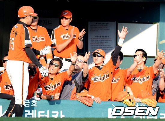 3일 오후 서울 잠실구장에서 열린 '2012 팔도 프로야구' LG 트윈스와 한화 이글스의 경기, 2회초 2사 1,3루 한화 최진행이 좌측담장을 넘기는 3점 홈런을 치고 덕아웃에서 선수들과 하이파이브를 하고 있다.