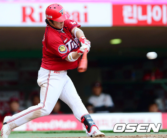 2일 오후 인천 문학구장에서 열린 '2012 팔도 프로야구' SK 와이번스와 KIA 타이거즈의 경기 4회초 1사 만루 김선빈이 3타점 2루타를 치고 있다.