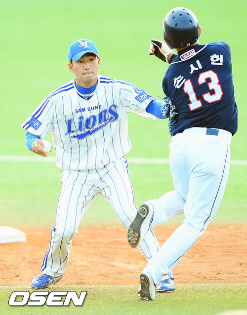 3일 오후 대구 시민구장에서 열린 '2012 팔도 프로야구' 삼성 라이온즈와 두산 베어스의 경기 5회초 무사 주자 1루 두산 최재훈의 유격수 땅볼 때 삼성 유격수 김상수가 2루에서 자신의 오른손에 볼을 쥐고 빈글러브로 두산 손시헌을 태그하고 있다.