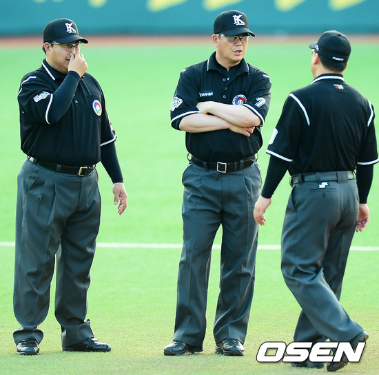 3일 오후 대구 시민구장에서 열린 '2012 팔도 프로야구' 삼성 라이온즈와 두산 베어스의 경기 5회초 무사 주자 1루 두산 최재훈의 유격수 땅볼 때 삼성 유격수 김상수가 2루에서 자신의 오른손에 볼을 쥐고 빈글러브로 두산 손시헌을 태그한 후 1루로 송구 병살 처리가 되었으나 두산 김진욱 감독이 항의, 심판들이 모여 의논한 후 병살에서 원 아웃으로 결과가 번복되고 있다.