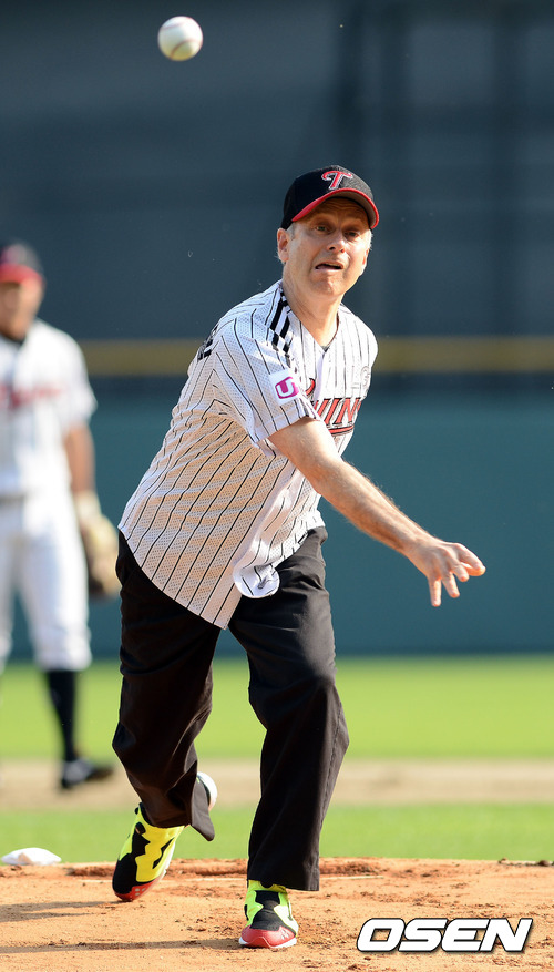 3일 오후 서울 잠실구장에서 열린 '2012 팔도 프로야구' LG 트윈스와 한화 이글스의 경기,'정의란 무엇인가'의 저자 마이클 샌델 하버드 대학 교수가 멋진 폼으로 시구를 하고 있다.