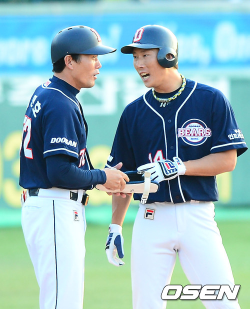 3일 오후 대구 시민구장에서 열린 '2012 팔도 프로야구' 삼성 라이온즈와 두산 베어스의 경기 5회초 2사 주자 2루 두산 고영민이 1타점 3루타를 날린 후 김민호 코치와 기쁨을 나누고 있다.
