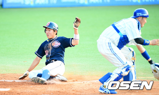 3일 오후 대구 시민구장에서 열린 '2012 팔도 프로야구' 삼성 라이온즈와 두산 베어스의 경기 5회초 2사 주자 2루 두산 김현수의 중견수 앞 1타점 적시타 때 2루 주자 정수빈이 홈으로 몸을 날리며 세이프되고 있다.