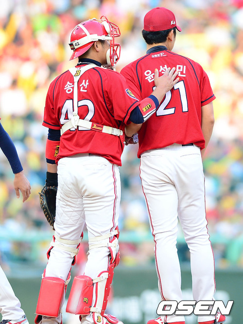 2일 오후 인천 문학구장에서 열린 '2012 팔도 프로야구' SK 와이번스와 KIA 타이거즈의 경기 5회말 1사 1,2루 송산이 마운드에 올라와 윤석민을 격려하고 있다.