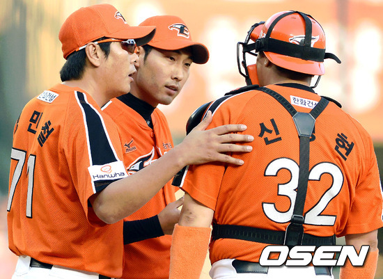 3일 오후 서울 잠실구장에서 열린 '2012 팔도 프로야구' LG 트윈스와 한화 이글스의 경기, 4회말 무사 1,2루 한화 정민철 코치가 투수교체를 위해 마운드에 올라 정재원과 신경현에게 이야기를 하고 있다,