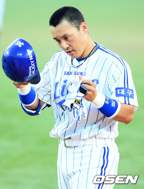 3일 오후 대구 시민구장에서 열린 '2012 팔도 프로야구' 삼성 라이온즈와 두산 베어스의 경기 6회말 2사 주자 1루 삼성 이승엽의 우월 홈런성 타구를 날렸으나 우익수 플라이 아웃 처리되자 아쉬운 표정으로 헬멧을 벗고 있다.