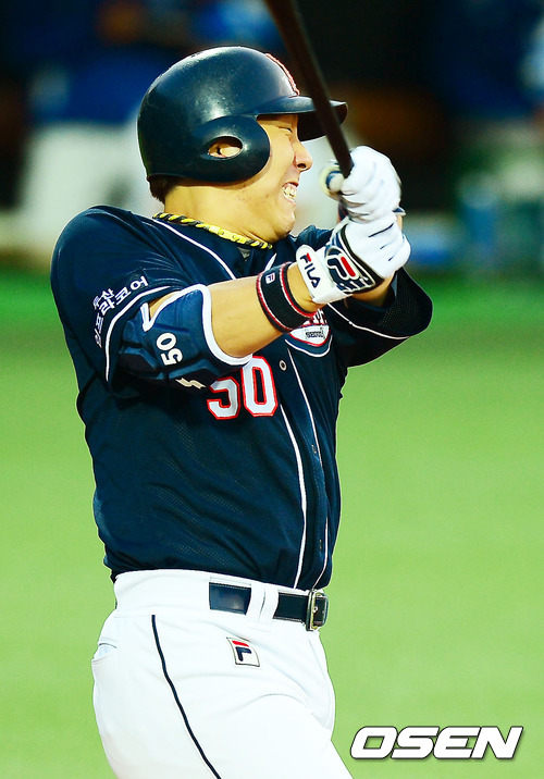 3일 오후 대구 시민구장에서 열린 '2012 팔도 프로야구' 삼성 라이온즈와 두산 베어스의 경기 5회초 2사 주자 2루 두산 김현수가 중견수 앞 1타점 적시타를 날리고 있다.