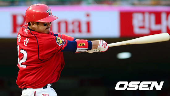 2일 오후 인천 문학구장에서 열린 '2012 팔도 프로야구' SK 와이번스와 KIA 타이거즈의 경기 7회초 1사 만루 송산이 2타점 적시타를 치고 있다.