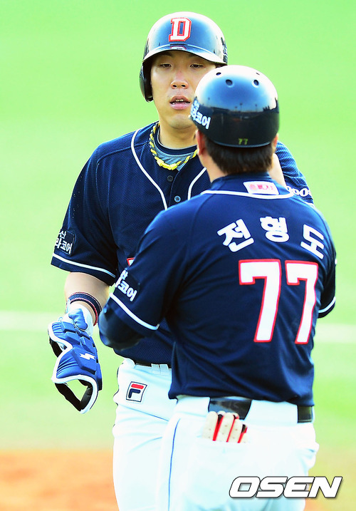 3일 오후 대구 시민구장에서 열린 '2012 팔도 프로야구' 삼성 라이온즈와 두산 베어스의 경기 5회초 2사 주자 2루 두산 김현수의 중견수 앞 1타점 적시타를 날린 후 2루에서 전형도 코치와 하이파이브를 하고 있다.